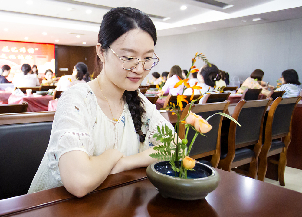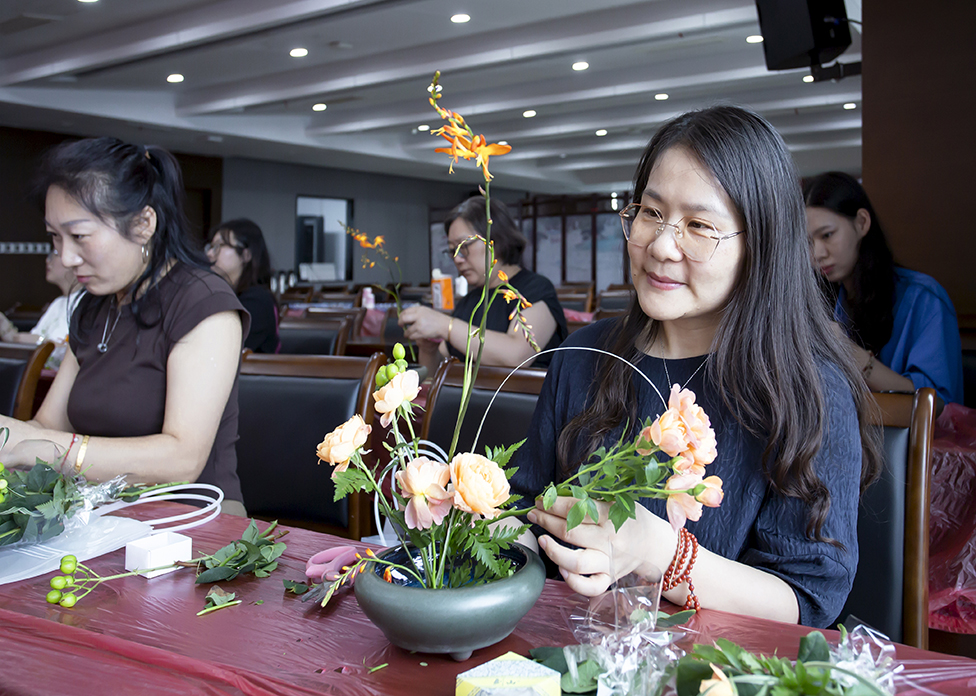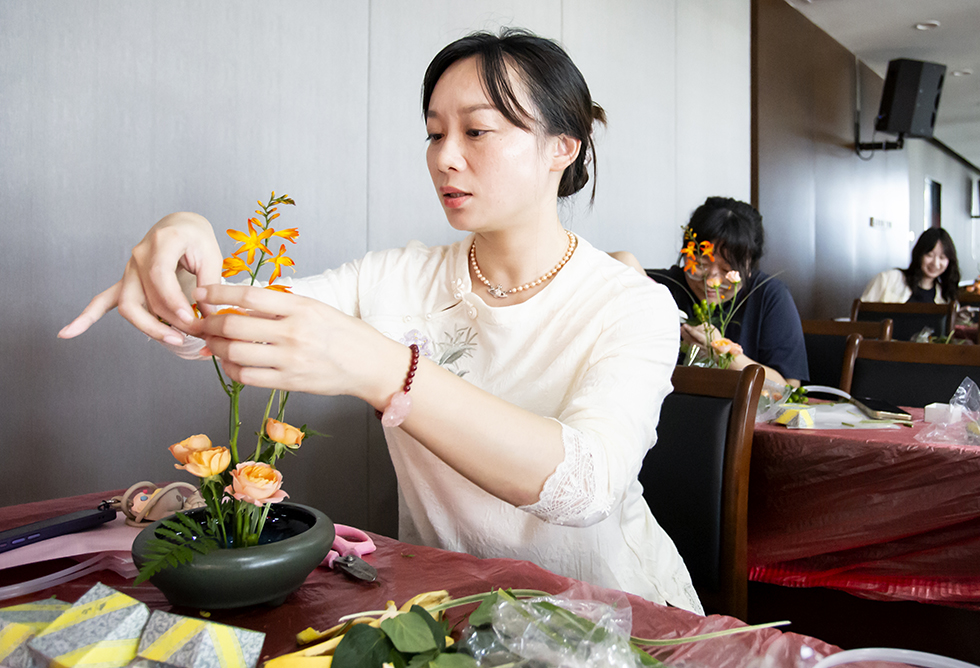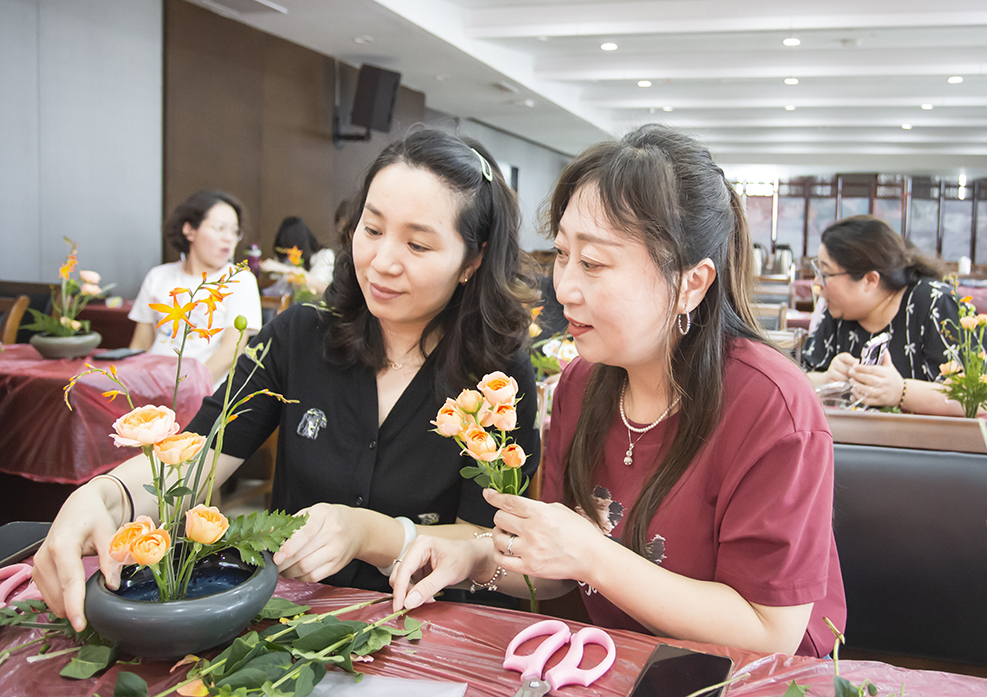 职工们欢聚一堂,手执花枝,心怀诗意,共同探索传统插花艺术之美。在老师的详细讲解和指导下,大家充分发挥想象力和创造力,用自己灵巧的双手对花材进行修剪、整枝、搭配。